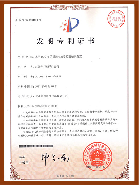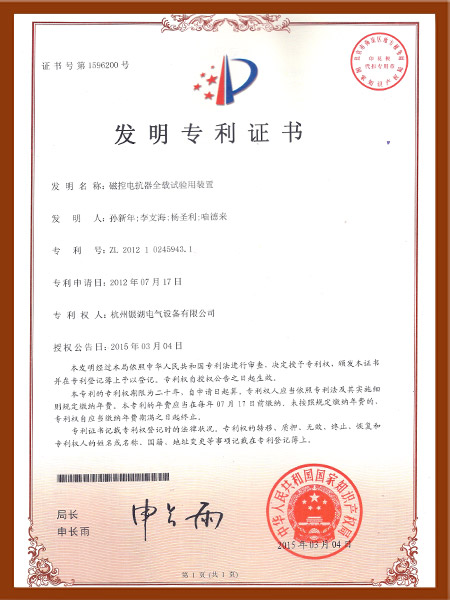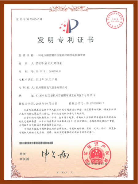 磁控电抗器装置发明专利证书