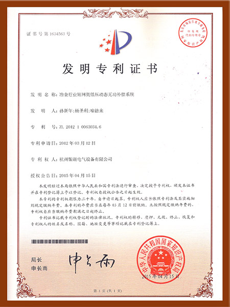低压动态无功补偿系统专利证书