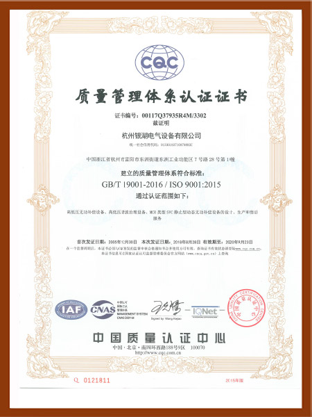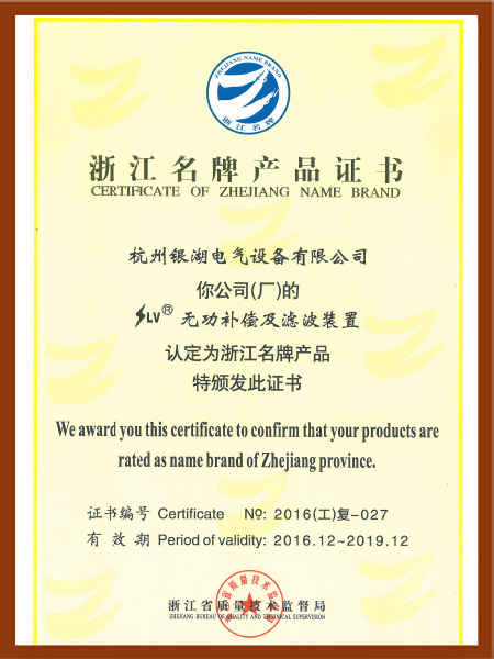 浙江无功补偿装及滤波置名牌产品证书