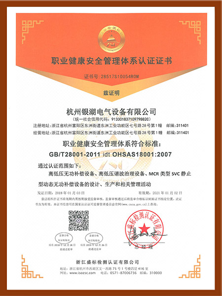 职业健康安全管理体系认证证书